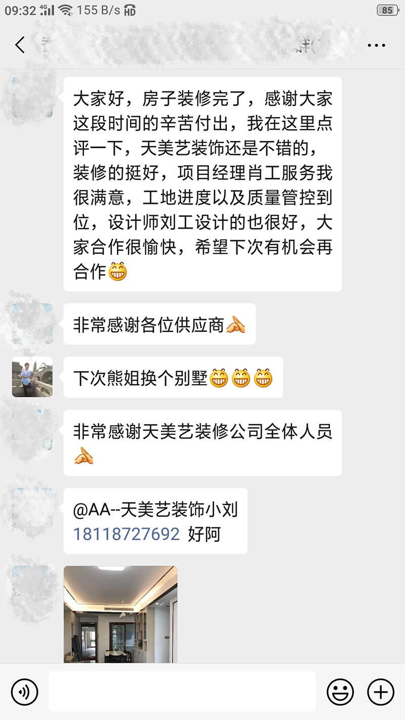 大家好,房子裝修完了,感謝大家這段時間的辛苦付出,我在這里點評一下,天美藝裝飾還是不錯的,裝修的挺好,項目經(jīng)理肖工服務(wù)我很滿意,工地進度以及質(zhì)量管控到位,設(shè)計師劉工設(shè)計的也很好,大家合作很愉快,希望下次有機會再合作,非常感謝天美藝裝修公司全體人員。